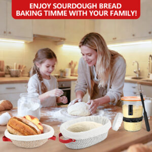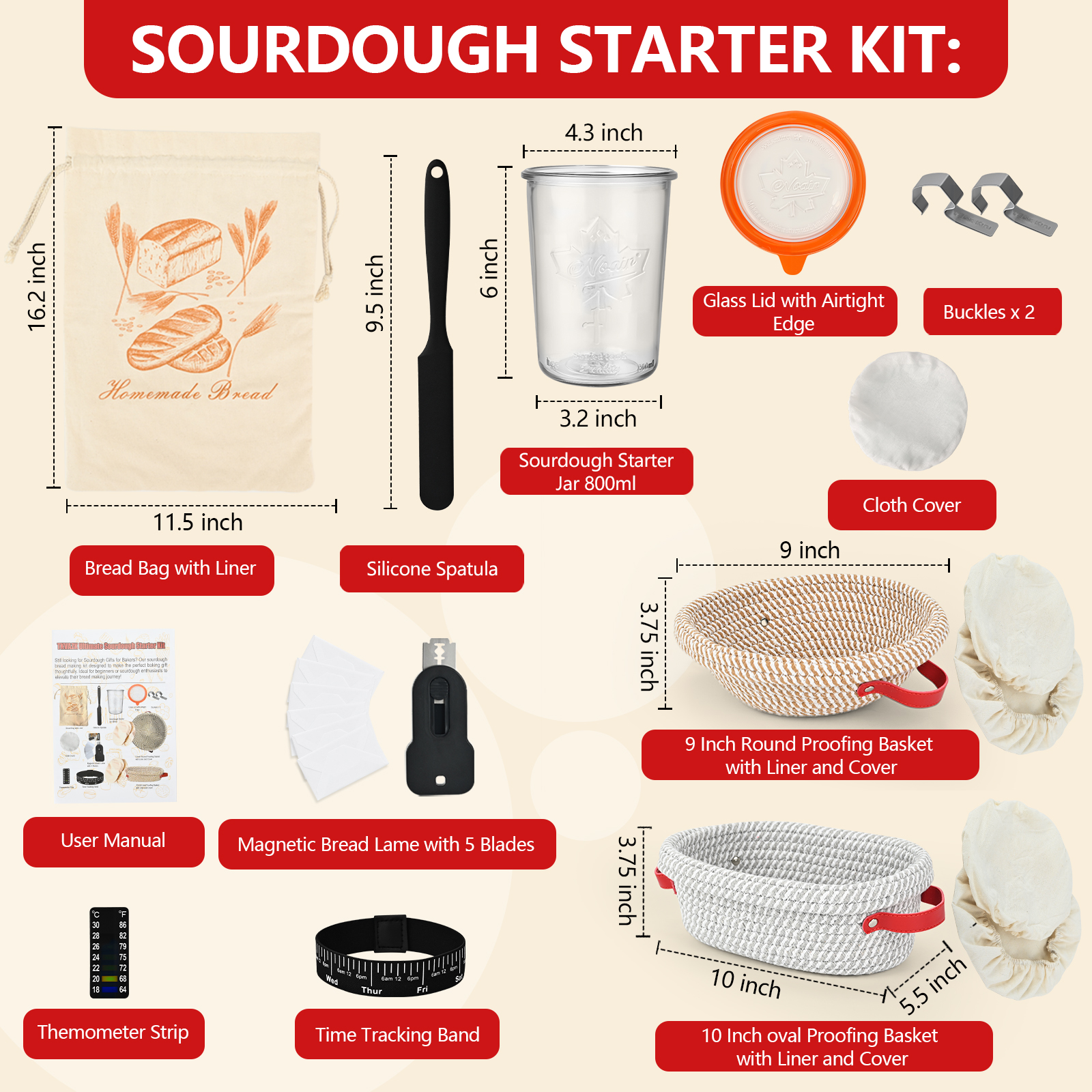 • All-in-One Sour dough Starter Kit: Much helps for your sourdough baking journey with our professional sourdough kit! Our Bread making kit Including a sourdough starter jar kit, 9″ round & 10″ oval proofing baskets, magnetic bread lame and reusable lined bread bag. Ideal for homemade artisan bread, San Francisco sourdough, or rustic boules. Everything you need to bake like a baking pro