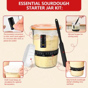 • Thickened Glass Sourdough Starter Jar Wide Mouth: Sourdough jar is made of high-quality thickened glass which is ultra-durable and is safe in the dishwasher. Wide-mouth design allows effortless access to your sourdough starter as well as clean. Breathable cloth cover and glass lid with silicone edge offer you flexibility in sourdough bread making